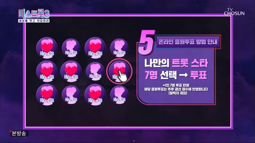5. 나만의 트롯 스타 7명을 선택합니다. 하루에 1번 투표가 가능합니다.